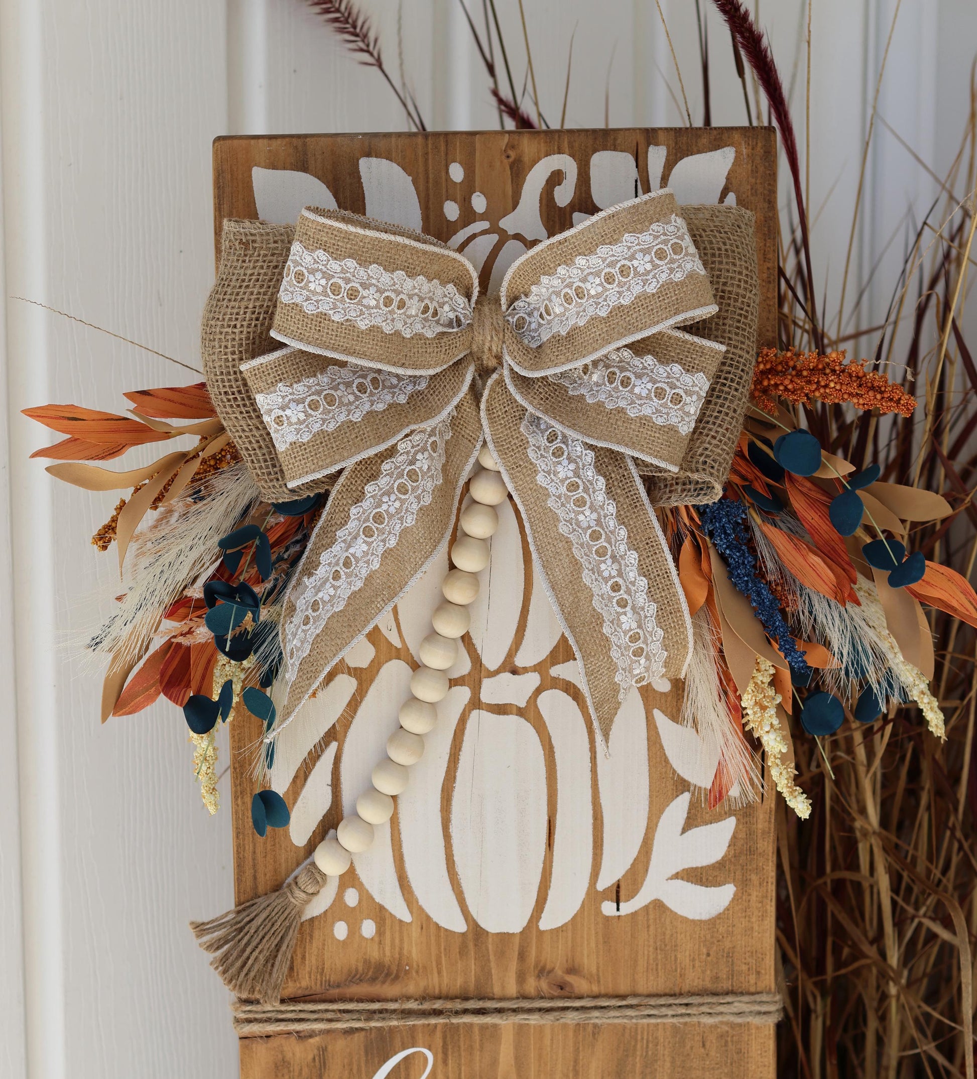 Topped with a beautiful burlap and lace bow, accented by wood beads and fall florals, this sign makes a bold yet tasteful statement on your front porch, patio, or entryway. It’s the perfect blend of farmhouse charm and fall festivity!