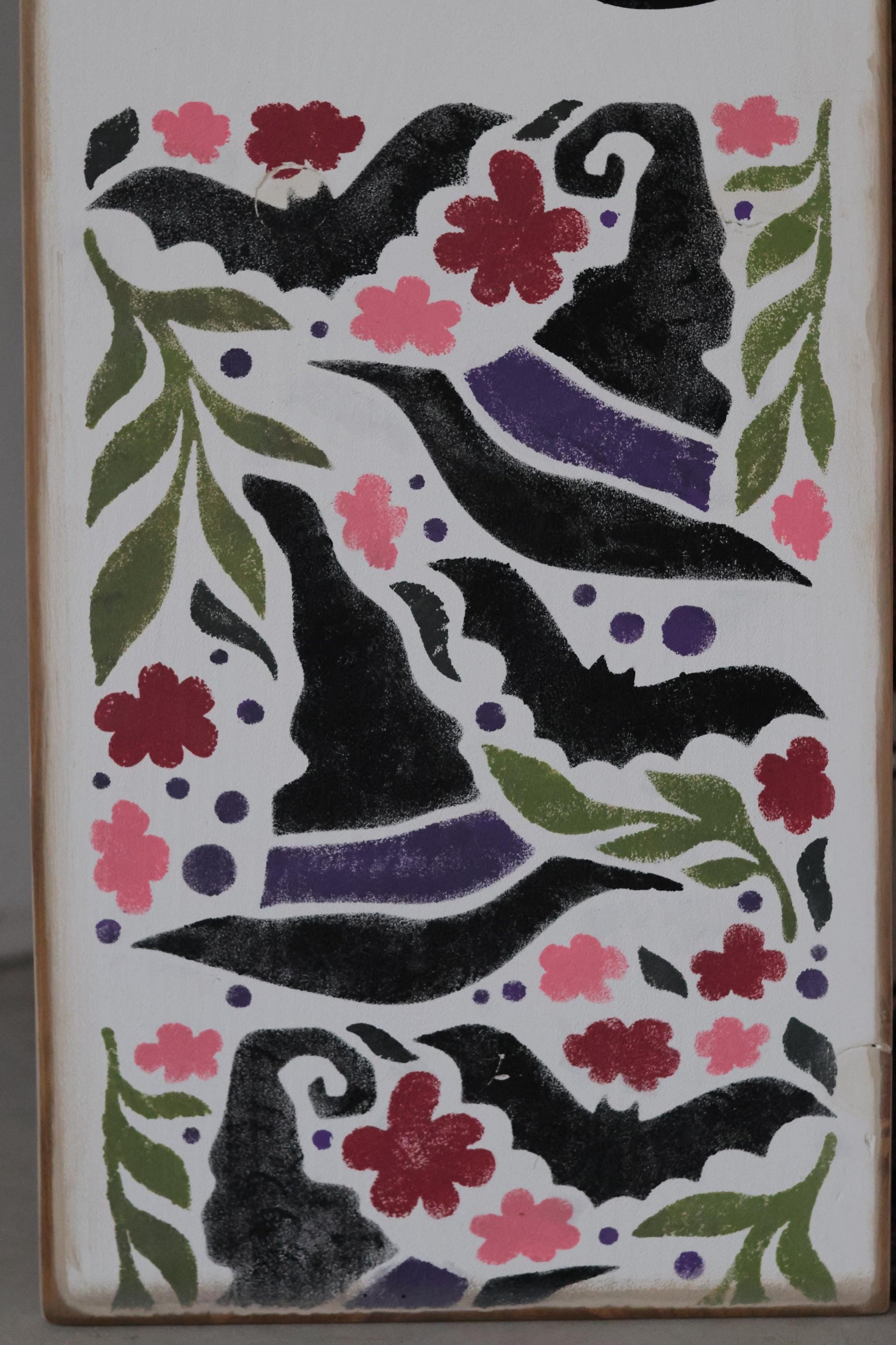 Design: Classic white background with hand-painted witch hats, floral accents, and bold black “Witches Welcome” lettering with a broomstick detail.