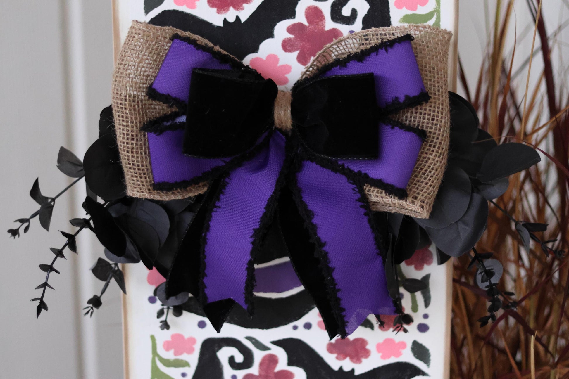 Topper: Finished with a layered burlap and velvet bow in rich purple and black, paired with black foliage for a dramatic Halloween touch.